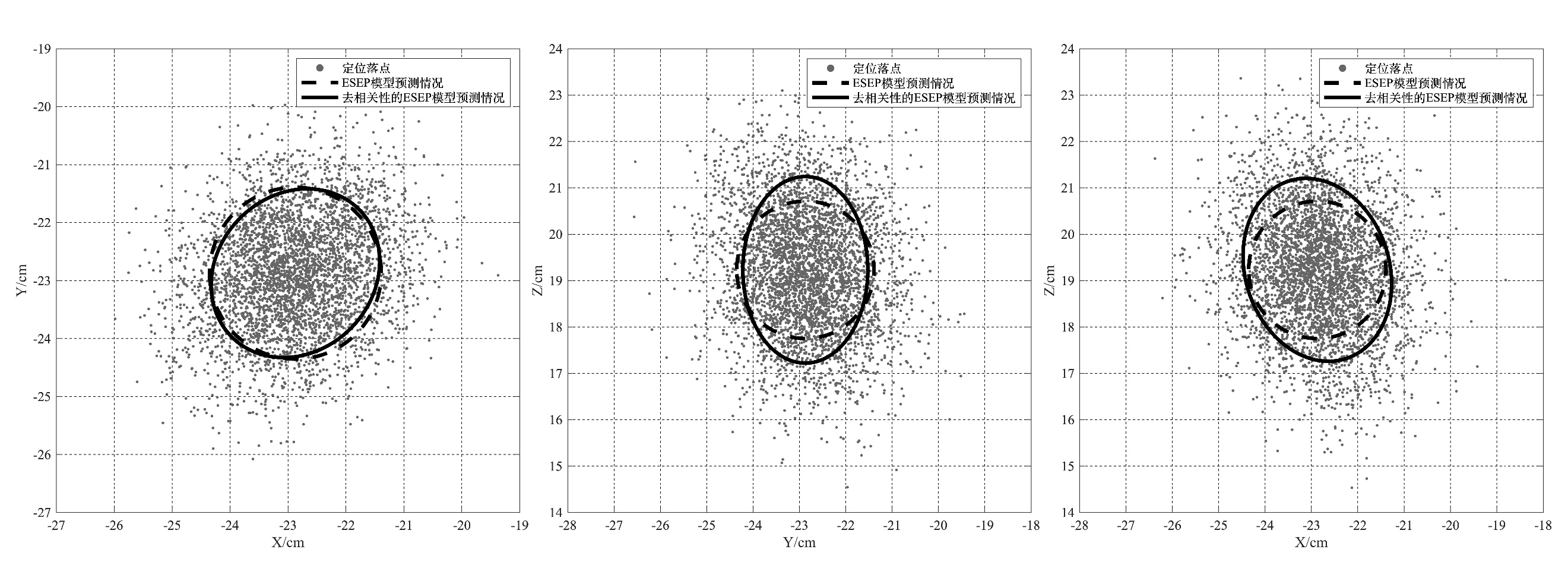 為了驗證數學模型程序的預測效果,本節對坐標為(420,420,60)的標簽在理想情況下模擬生成3000個定位落點,再使用ESEP模型和去相關性的ESEP模型預測標簽的定位落點信息,如圖1所示??梢杂^察到去相關的ESEP模型不受三坐標軸方向的限制,在三視圖中與實際落點的整體傾斜趨勢一致,在模擬中的預測區域更接近于落點分布形狀,從而更好地概述了定位系統的精度。