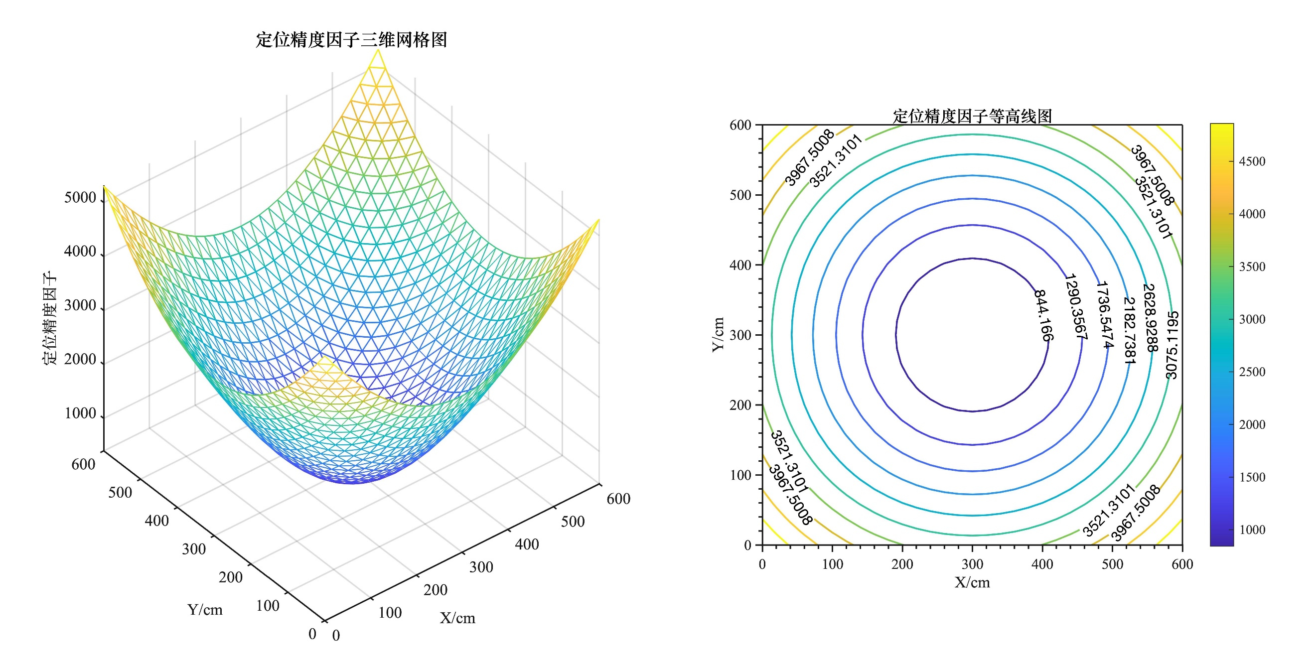 在精度評價模型求解出的四頂角定位系統的數據中,取高度為60cm的平截面繪制精度評價因子E的三維網格圖與等高線圖,如圖2所示。該領域的大量實驗數據表明,在基站矩形布局的情況下,定位誤差從中心向外逐漸增大,與本文模型的模擬情況相契合。