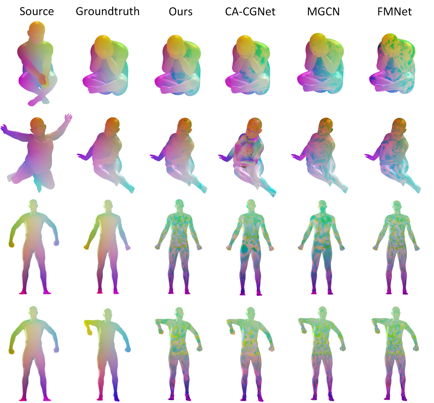 圖4 各種方法在KIDS和SCAPE數據集上的形狀匹配結果可視化