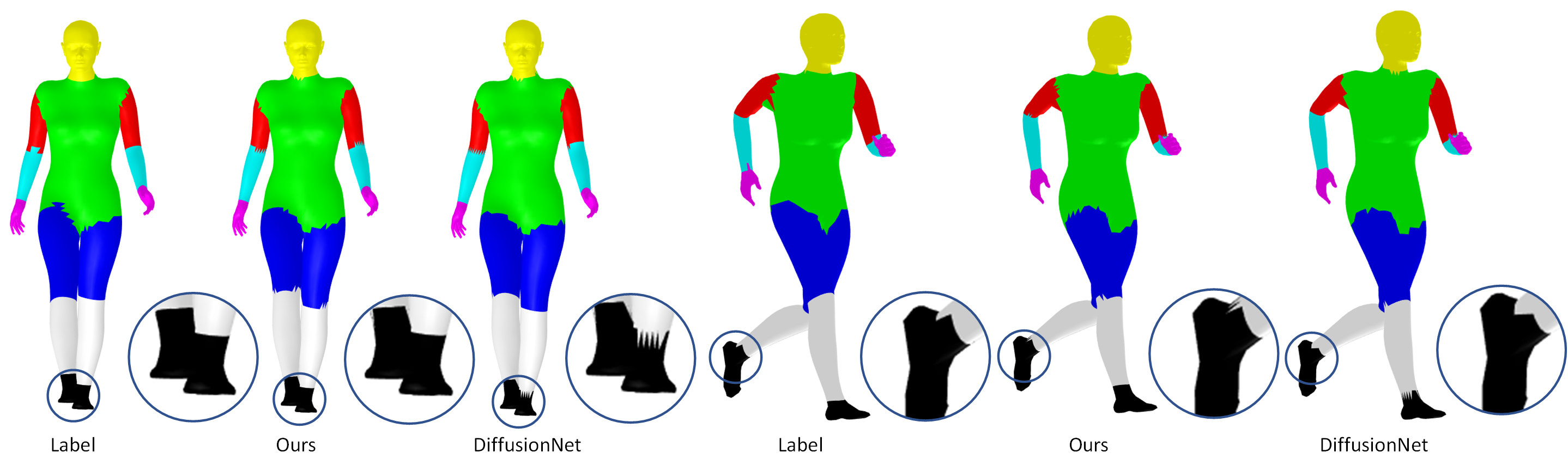將DGANet在SHREC數據集上的語義分割結果可視化,如圖2所示。通過放大局部細節,與DiffusionNet對比,DGANet的語義分割精度高于DiffusionNet,細節更加準確,更接近真實分割結果,證明DGANet具有較強的魯棒性。進一步,圖3第一行、第二行分別展示了KIDS與TOSCA數據集的分割結果。可以看出,對于不同姿勢的三維人體模型,本章方法均取得良好的語義分割效果,表現出較強的魯棒性。