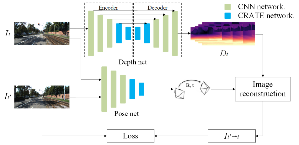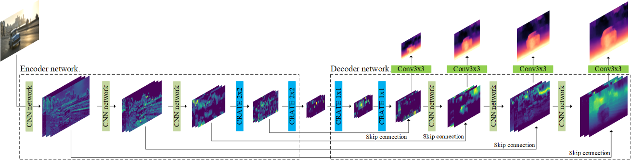 本文提出了一種全新的深度估計網絡CCDepth,該網絡通過CNN和CRATE分別提取圖像的細節和全局信息,以實現在自監督深度估計任務中高效地提取有用特征。相比較于現有的先進模型,CCDepth擁有更高的準確度,顯著降低了模型參數量,并提升了網絡可解釋性。