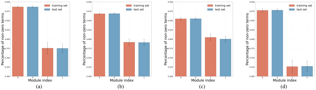 圖7 CRATE網絡層內各模塊輸出的非零項占比對比,(a)CCDepth中第一個CRATE網絡層的結果,(b)CCDepth中第二個CRATE網絡層的結果,(c)CCDepth中第三個CRATE網絡層的結果,(d)CCDepth中第四個CRATE網絡層的結果。
