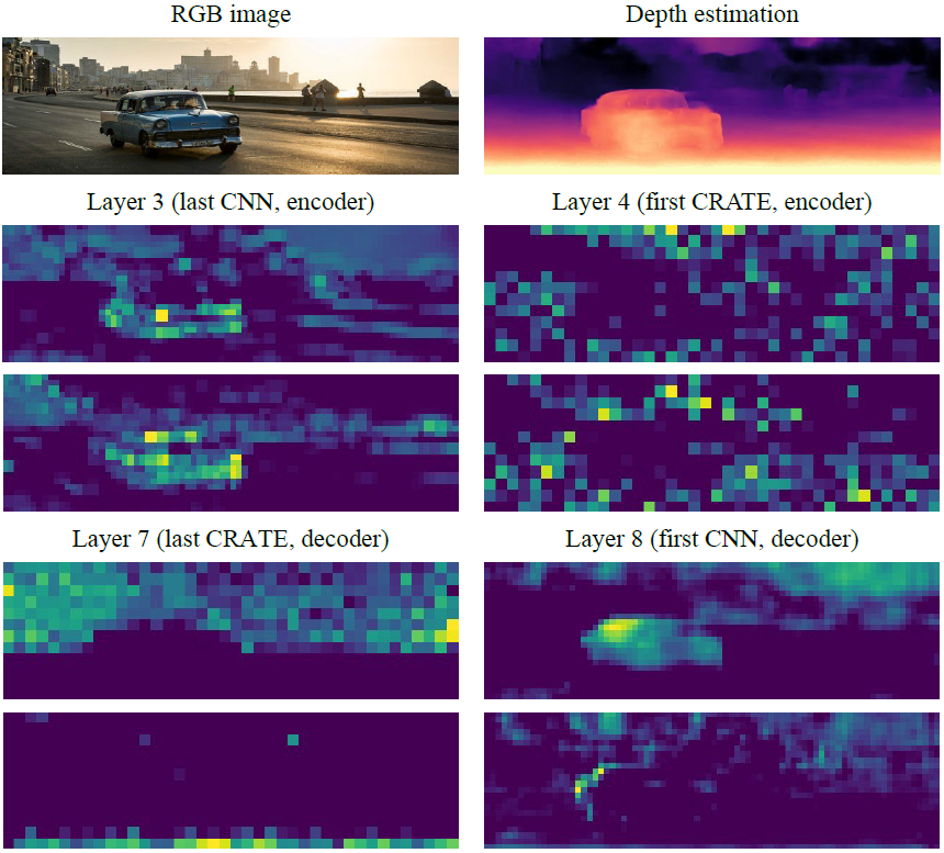 圖8所示,為網絡中CNN和CRATE網絡層的特征圖。可以明顯地看出,CNN網絡(layer 3和layer 8)更強調提取圖像的具體形狀和邊緣細節。相比之下,CRATE網絡則側重于描述圖像的環境等全局結構。這與CCDepth最初設計中通過CNN-CRATE結構分別提取圖像細節和全局信息的理念相吻合,進一步肯定了CCDepth網絡結構設計的有效性。