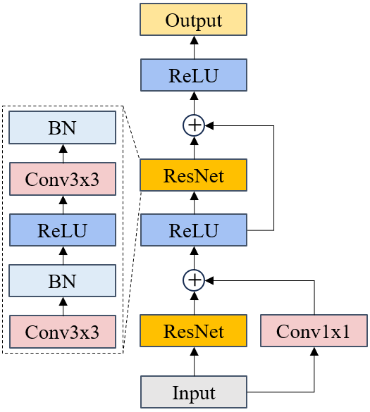 如圖2所示,為本文采用的CNN網絡層結構,該網絡由兩個最簡單的殘差塊構成。卷積核邊緣填充方式采用反射填充。