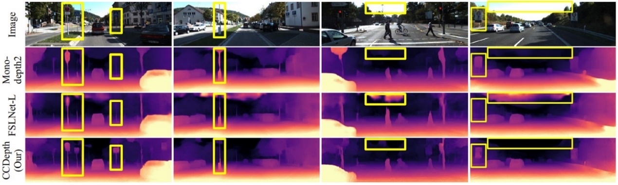 表1所示,為本文提出的CCDepth模型與現有先進模型的定量對比結果。CCDepth在KITTI測試集的預測誤差和精度上取得了更好的表現。同時,模型參數量僅有12.6M,相較于Monodepth2和FSLNet分別下降78.8%和23.6%。