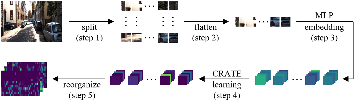 圖3為本文CRATE網絡層的工作流程,主要分為五步:第一步,將輸入圖像分割為若干圖像塊;第二步,破壞圖像的二維結構,將圖像塊展開為一個序列;第三步,被映射為一個向量,并輸入CRATE網絡;第四步,向量集合(tokens)在CRATE網絡中學習并被更新;第五步,向量集合被重新組合為圖像格式,得到該層的輸出特征圖,即步驟2的逆過程。