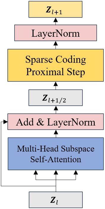 圖4為CRATE網絡的基礎模塊結構圖,網絡由多頭子空間自注意力模塊(Multi-Head Subspace Self-Attention block,MSSA)和一個迭代收縮閾值算法模塊(Iterative Shrinkage-Thresholding Algorithms block,ISTA)構成,分別擔任壓縮(去噪)和稀疏化的操作。