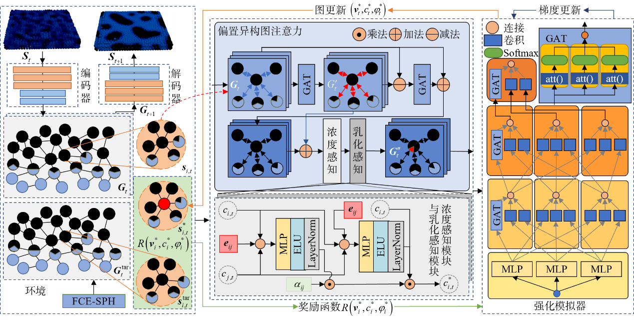 本文提出一種脈動風場Cahn-Hilliard乳化SPH方法(fluctuating wind field Cahn-Hilliard emulsion smoothed particle hydrodynamics, FCE-SPH),結合脈動風場描述海上溢油的混合和乳化分解過程。針對模擬效率不高的問題,設計了兩相流物理感知深度強化學習偏置圖注意力網絡,以加速流體模擬仿真,通過異構偏置圖注意力模塊,增強網絡獲取粒子特征的表達能力。