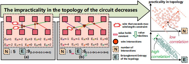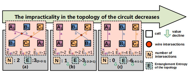 我們展示了定義的糾纏熵可有效的用于電路拓撲的初始化過程。圖1展示了三個不同的電路拓撲示例,可以觀察到隨著拓撲結構中交點個數(N)的減少,電路的布局效果逐漸提高。同時,我們還展示了糾纏熵這一指標與交點的數量緊密相關,且利用糾纏熵(E)的變化來優化初始布局要好于直接使用交點個數(如圖2所示)。