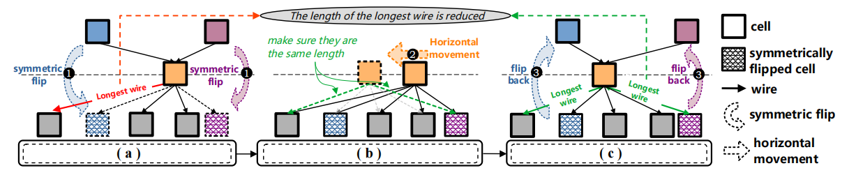 初始狀態下,兩個單元通過一條可能超出最大布線長度約束的長布線相連。為簡化問題,我們采用基于投影思想的對稱翻轉方法,將某單元相鄰的兩行單元沿著單元所在的軸線對稱地“翻轉”到同一行上,同時保持布線長度不變。此步驟為理論操作,實際布局中不執行翻轉。在對稱處理的基礎上,通過水平移動將單元移至中間位置。