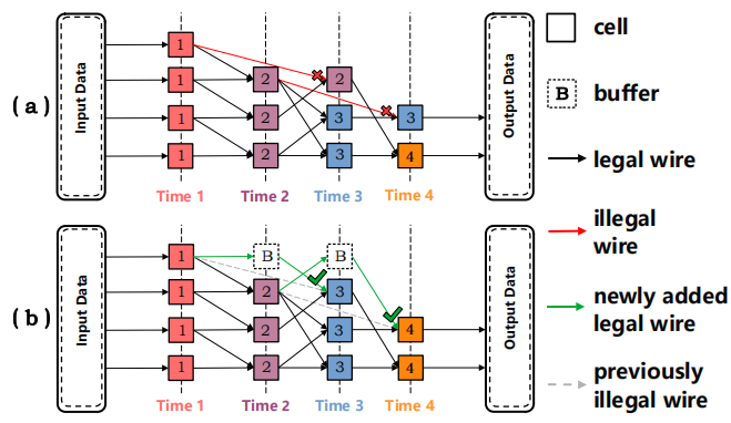 隨著超導技術的發展,絕熱量子磁通參數邏輯(AQFP)作為一種高效的超導邏輯技術,因其能耗顯著低于傳統超導邏輯(如RSFQ)和CMOS技術而備受關注。然而,隨著電路規模的增大,AQFP電路的設計面臨諸多挑戰,特別是數據同步和最大線長約束問題,這些問題導致需要插入大量緩沖器來維持電路的正常運行,從而顯著增加了電路的功耗和延遲。現有EDA工具針對CMOS技術設計,無法直接應用于AQFP電路,因此迫切需要開發專門針對AQFP電路的EDA工具。針對AQFP電路布局中緩沖器插入過多的問題,本文提出了一種創新的布局框架,旨在通過最小化額外緩沖器的需求來提升AQFP電路的性能。該框架利用糾纏熵進行拓撲初始化,并通過投影方法進行布局,有效減少了緩沖器的插入數量,同時顯著加速了布局過程。這一研究不僅有助于推動AQFP電路的設計自動化,也為超導電子學領域的發展提供了新的解決方案。