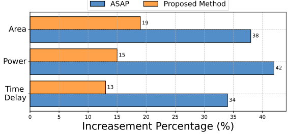 通過柱狀圖展示了在c3540測試例上,應用ASAP算法和本文提出的算法后,電路的延時增加百分比、功耗增加百分比和面積增加百分比的比較。結果顯示,與ASAP算法相比,我們提出的算法的電路的延時、功耗和面積的增加百分比均顯著降低,表明算法在優化電路性能方面具有顯著優勢。具體來說,延時增加百分比從34%降低到13%,功耗增加百分比從42%降低到15%,面積增加百分比從38%降低到19%,體現算法在提升電路效率方面的有效性。