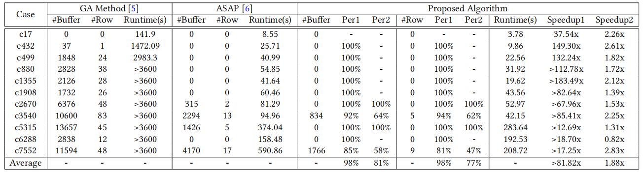 表2展示了三種算法(遺傳算法GA、ASAP算法和本文提出的算法)在多個測試案例上的性能比較。結果顯示,在插入的緩沖器數量和緩沖器行數方面,我們提出的算法表現最優,平均減少了98%和81%的緩沖器需求,顯著優于其他兩種方法。在時間開銷方面,我們的算法也表現出色,平均加速比分別達到GA方法的81.82倍和ASAP方法的1.88倍,體現了其在提高布局效率方面的優勢。
