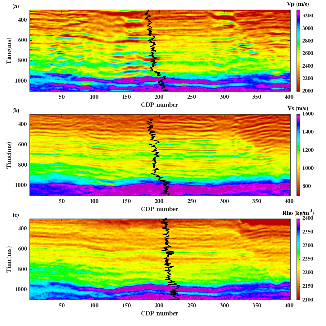 圖2-圖4所示為對來自中國東部某實際油田資料處理結果。分別對應基于L2范數正則化、L1范數正則化、振幅熵正則化的反演結果。每幅圖從上至下依次為縱波速度、橫波速度、密度反演結果;圖中黑線為對應第203道的測井曲線。從反演結果不難看出,基于L2范數正則化的反演結果分辨率較低,反演剖面較為模糊。基于L1范數正則化的反演結果分辨率有所提升,但仍不及基于熵正則化的反演結果,與前兩種正則化反演結果相比,基于熵正則化的反演結果分辨率較高,連續性較好,與測井曲線的變化趨勢也較為吻合,證明了本文提出算法的有效性和實用性。