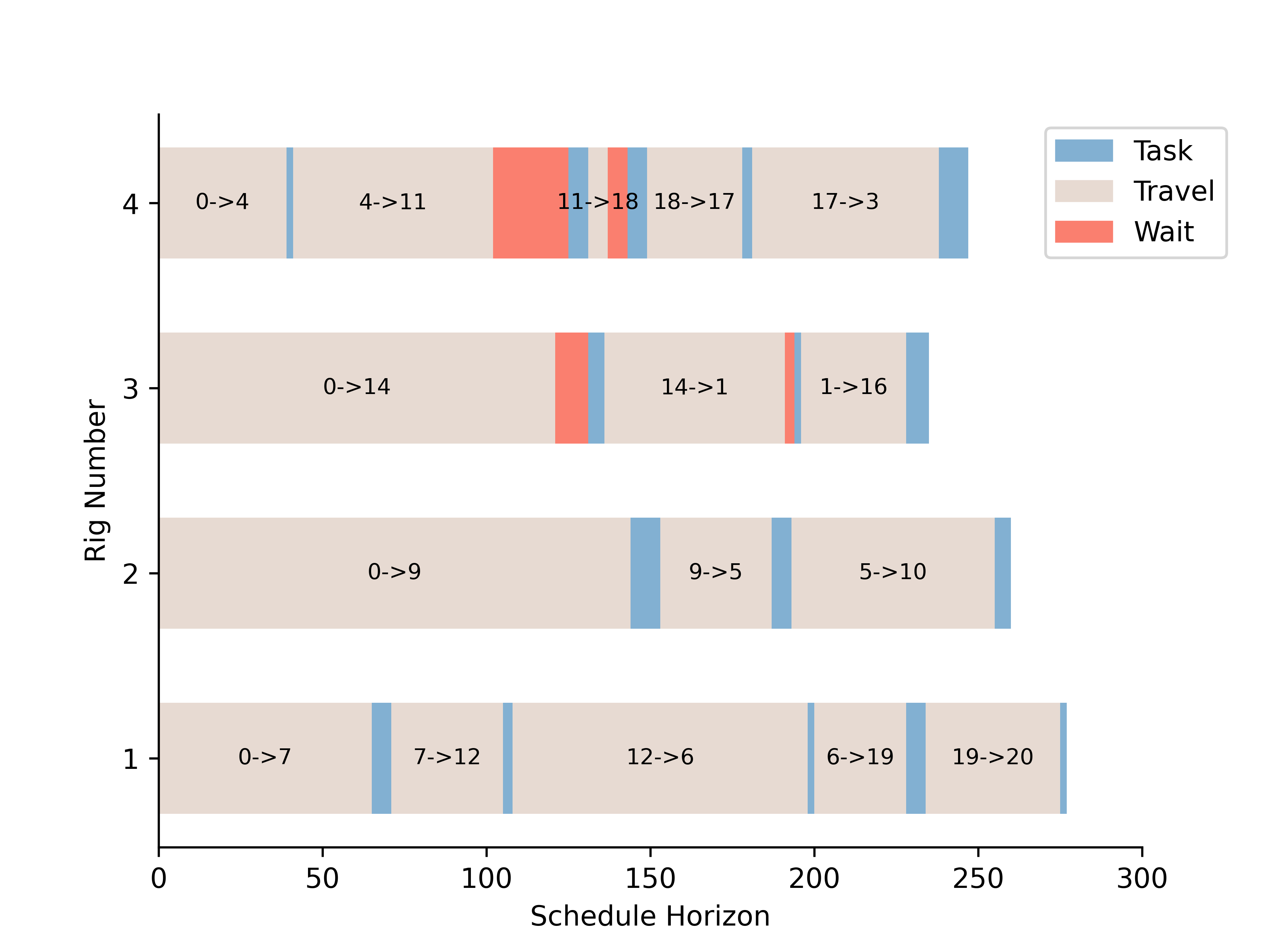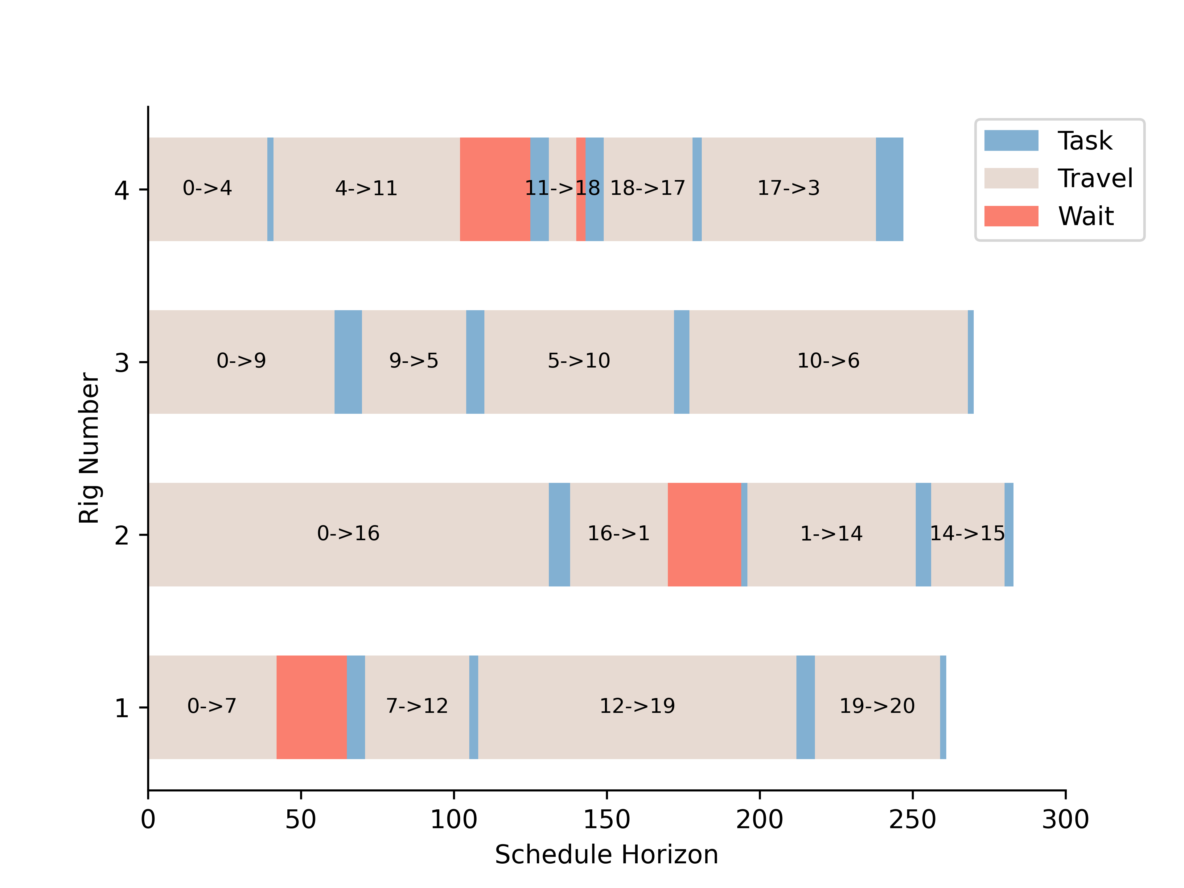 案列包括4臺修井機和20個待修井。給定實驗案例的總調度周期為300進行優化,優化生產損失為11971萬元,相應的路徑調度圖與甘特圖分別如下圖。