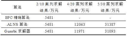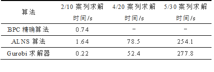 在小規模案列下,算法均能達到最優性能得到問題最優解;在一般規模案列下,精確算法已經不適用;ALNS算法求解時間和質量與Gurobi求解所得相似。