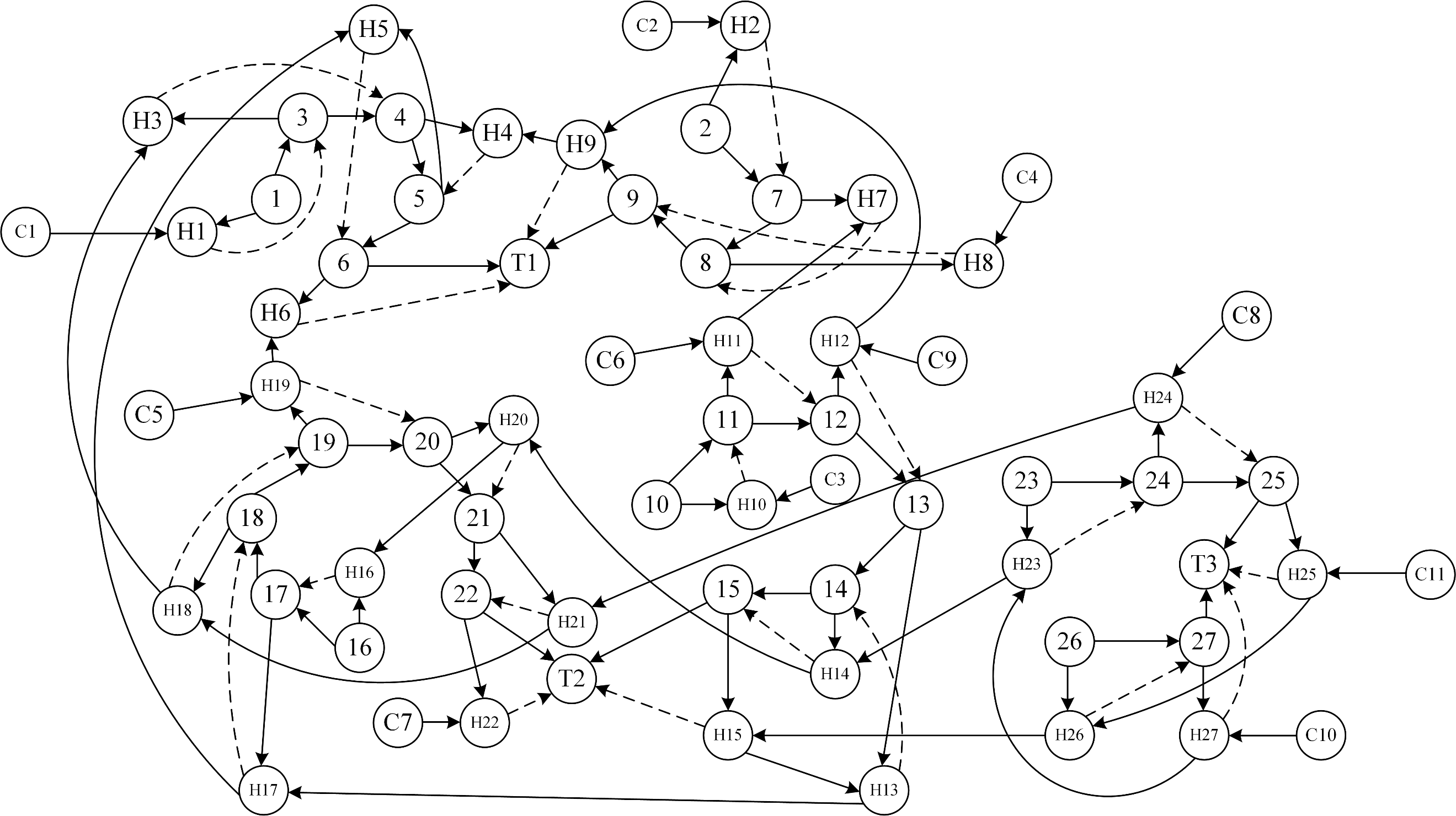 本文為確定換熱網絡中的關鍵變量,建立一個復雜原油換熱網絡的SDG模型。如圖所示,其中,節點表示換熱網絡中的流股溫度,有向邊表示換熱流股之間的關系。復雜原油換熱網絡的SDG模型:R可由以下四部分組成。