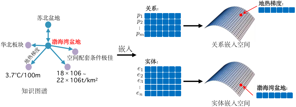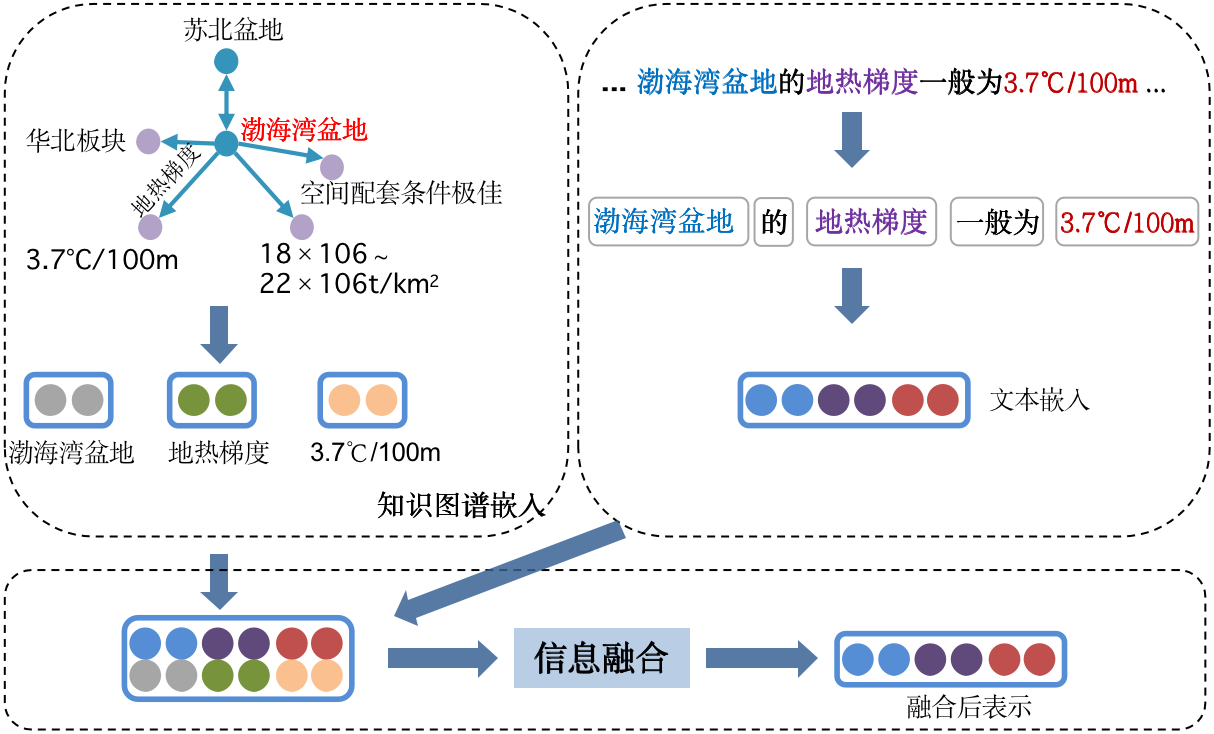 圖嵌入如圖2所示,將知識圖譜中的實體和關系映射到高維向量空間。而知識圖譜與文檔信息的融合如圖3所示。通過將知識圖譜中實體“渤海灣盆地”“18×106~22×106t/km2”“3.7℃/100m”等表示與段落表示中的對應詞的表示進行融合,增強了段落語義信息。其中,首先分析問句得到含油氣盆地知識圖譜中的對應子圖;然后通過預先訓練好的TransE嵌入模型得到問題對應知識圖譜中實體的向量表示;最后使用自注意力機制融合編碼文本段落信息和實體信息,從而得到更新后的段落表示。