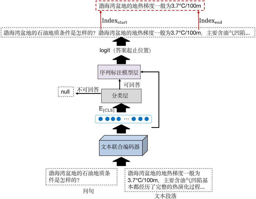 深度語義匹配模型的結構如圖4所示。首先,將問句和候選段落利用BERT預訓練語言模型進行聯合嵌入,獲得的編碼向量中融合了上下文的語境信息;然后,將編碼序列首位[CLS]標記對應的向量作為聚合序列表示,訓練分類器判斷在該段落中問題是否存在答案;對于段落中不存在答案的情況,直接將答案設為空值;對于段落中存在答案的情況,利用序列標注模型進行詞級別預測,確定答案在段落中的起止位置,抽取出對應的文本子序列作為答案。