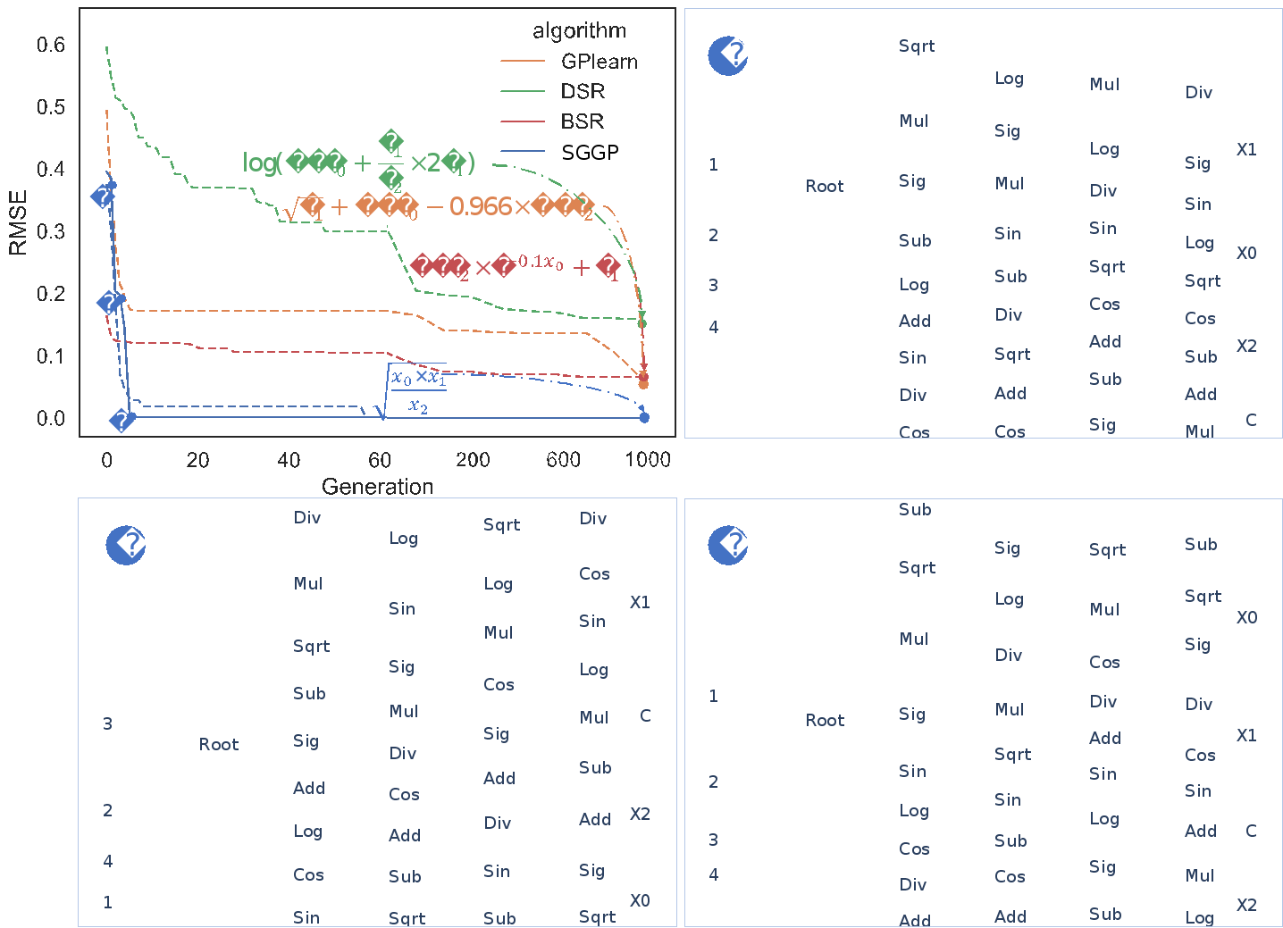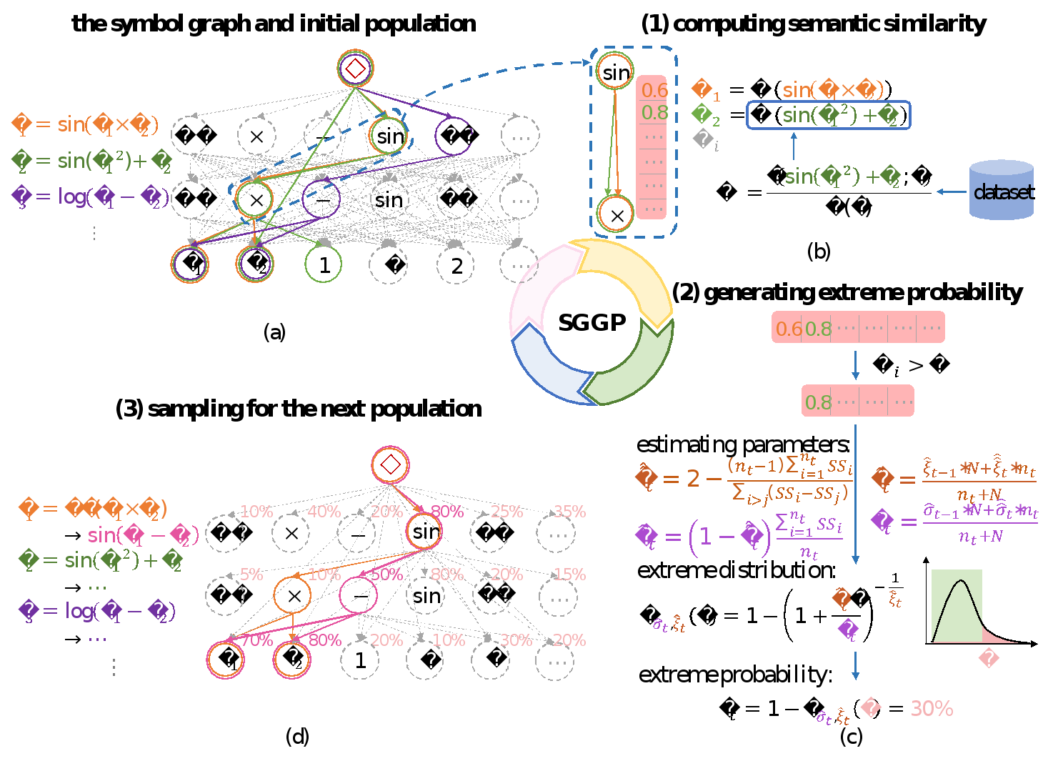 本文設(shè)計(jì)了一種新的符號(hào)圖,用來(lái)描述符號(hào)回歸的表達(dá)式空間。在符號(hào)圖的基礎(chǔ)上,我們提出了一種新的遺傳編程方法——符號(hào)圖遺傳編程(SGGP)。SGGP采用極值分布以及語(yǔ)義相似度來(lái)計(jì)算符號(hào)圖中每條邊的概率。然后,它基于這些概率對(duì)新個(gè)體進(jìn)行采樣來(lái)有效搜索正確的表達(dá)式。實(shí)驗(yàn)表明,SGGP優(yōu)于21種符號(hào)回歸方法,其中包括最新的機(jī)器學(xué)習(xí)/深度學(xué)習(xí)方法和演化計(jì)算方法。