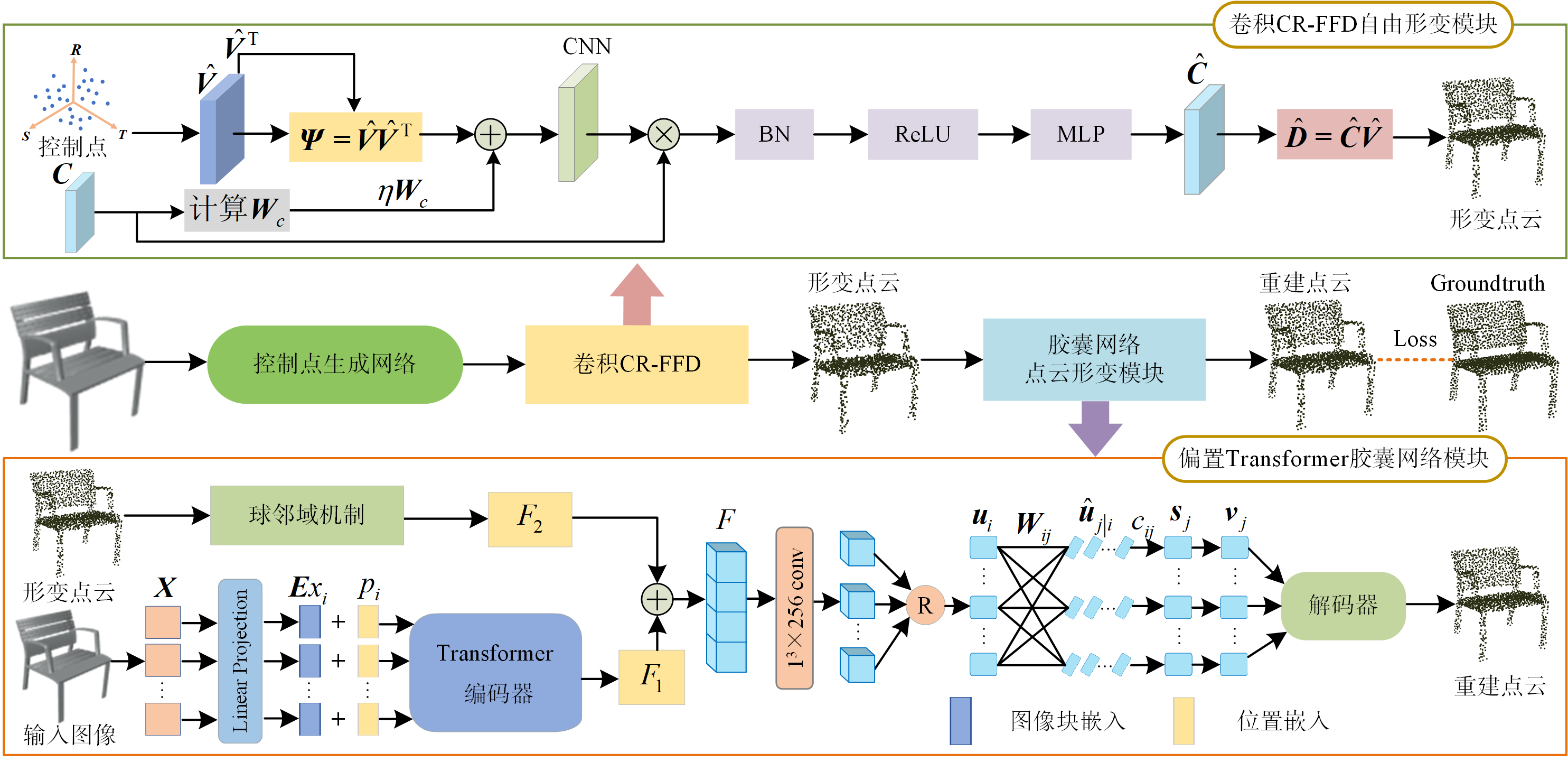 本文提出一種融合卷積CR-FFD(Catmull-Rom splines based FFD)與偏置Transformer膠囊網絡的單視圖三維物體重建方法。首先將Catmull-Rom樣條與FFD結合提出CR-FFD方法,通過Catmull-Rom樣條基函數對點云模型控制點進行插值,以保持形變過程的拓撲結構一致性;然后提出基于卷積神經網絡(convolutional neural networks, CNN)的最小二乘求逆解法加速CR-FFD的求解過程;為了增強網絡的局部特征表達能力,將偏置注意力(offset-attention, OA)與基于Transformer的膠囊網絡結合,提出偏置Transformer膠囊網絡,通過OA捕獲點云形狀的細粒度特征以保持二維圖像與三維模型的空間結構一致性。
