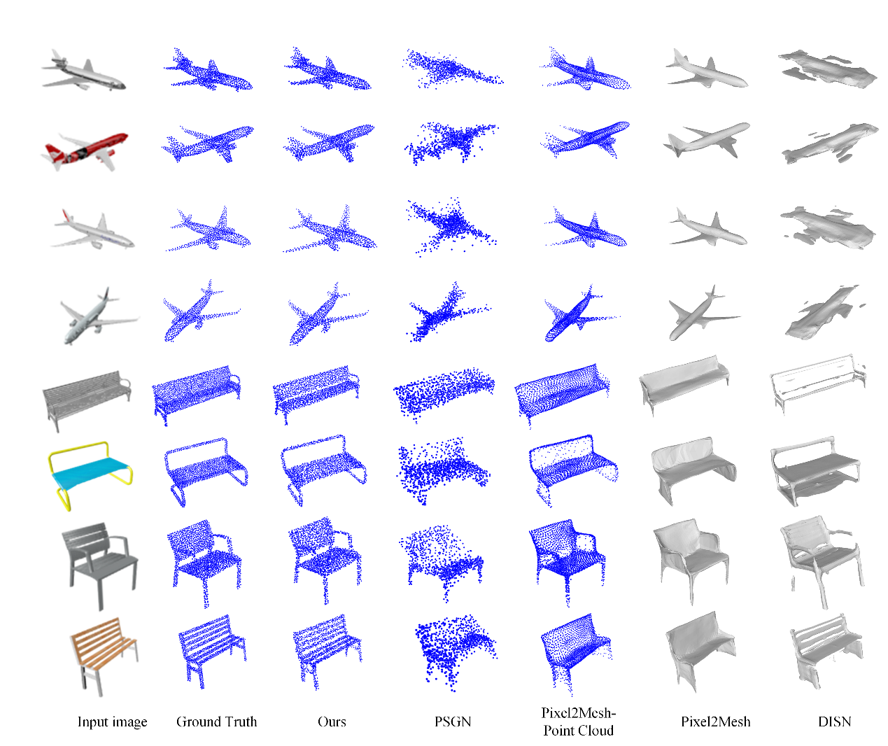 在Airplane和Bench數據集上,與PSGN,VGG-Pixel2Mesh和DISN這3種方法進行對比,結果如圖2所示。可以看出,本文方法在Airplane數據集上的重建結果與VGG-Pixel2Mesh相近,優于其他2種方法,均取得較好的重建效果。但本文方法重建結果的噪聲更少,點云分布更加均勻,更加貼近真實形狀;在有孔洞的Bench模型上,本文方法的重建結果明顯優于其他方法,證明該方法具有較好的魯棒性。