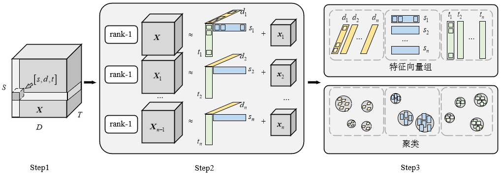 Step3,模式提取。通過(guò)連續(xù)秩1張量分解得到了多組低維向量,這些向量組都不同程度保留了原始三階張量的特征。將每個(gè)張量中包含的3個(gè)一維向量按不同維度進(jìn)行劃分,得到描述不同維度特征的特征向量組。通過(guò)聚類方法對(duì)特征向量組進(jìn)行聚類,可以得到綜合參數(shù)在不同維度上更詳細(xì)的時(shí)空模式。