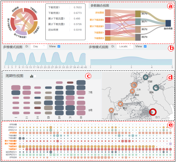本文根據(jù)某成品油運(yùn)輸管道歷史運(yùn)行數(shù)據(jù),選取管線輸運(yùn)模式和局部地區(qū)用油模式2個(gè)具有實(shí)際意義的角度進(jìn)行了案例分析,如圖3所示。兩個(gè)案例的分析結(jié)果驗(yàn)證了MPVis系統(tǒng)的可用性和有效性。領(lǐng)域?qū)<艺J(rèn)為本文的分析方法及可視化手段能夠在很大程度上降低工作復(fù)雜度,對(duì)現(xiàn)階段管道領(lǐng)域基于數(shù)據(jù)驅(qū)動(dòng)的決策支持來(lái)說(shuō)具有較大指導(dǎo)意義。