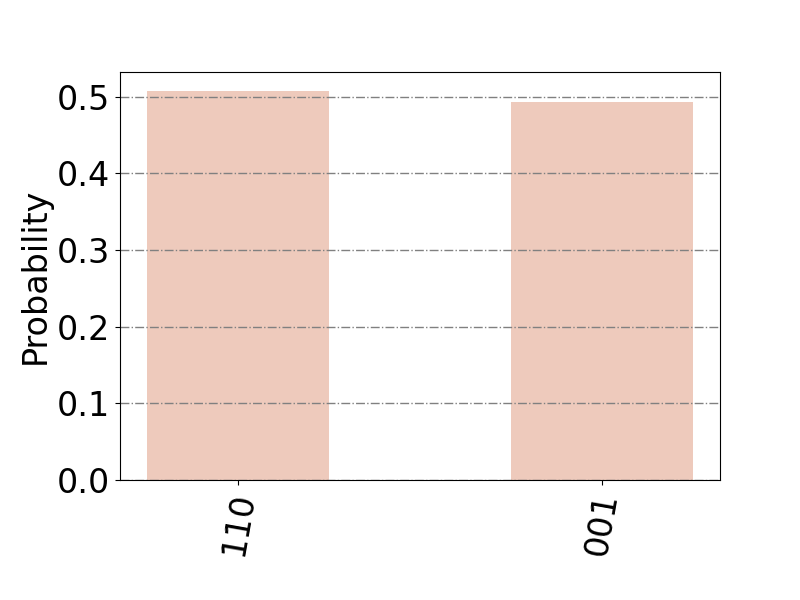 模擬結(jié)果如圖3所示,橫坐標(biāo)表示量子態(tài),對應(yīng)到無向圖的頂點(diǎn)集合,縱坐標(biāo)表示該量子態(tài)被測量得到的概率。算法執(zhí)行完畢后,以高概率獲得兩個極小支配集。通過Grover量子搜索算法獲取所有的極小支配集后,利用經(jīng)典算法在這些集合中進(jìn)行最小支配集的搜索,最終發(fā)現(xiàn){A}是最小的支配集。