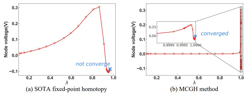 由圖可知,對于SOTA同倫,由于電流增益的強非線性,當λ達到0.96左右時,解曲線出現不連續。而本文所提出的MCGH可以收斂,并且λ最終迭代到1。此外,可以發現當λ在0~0.999之間時,我們方法的解曲線非常光滑,λ = 1附近的波動主要是由于我們引入的線性輔助算子所導致的。