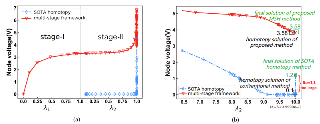 非線性直流分析是晶體管級電路仿真中最重要的任務之一。同倫法在改善牛頓-拉夫遜(NR)方法的收斂性問題方面取得了巨大成功。然而,在某些高阻(HiZ)節點處嵌入同倫參數可能會導致該類節點在同倫參數達到1時的節點電壓遠離真實的直流解,即使理論上此刻的電路應該等價于原始電路,從而導致在最終的NR驗證階段出現新的收斂失敗問題。在本文中,我們提出了一種HiZ節點感知的多階段同倫框架MSH,使HiZ節點和其他節點能夠分別進行多階段延拓,以增強仿真的收斂性。