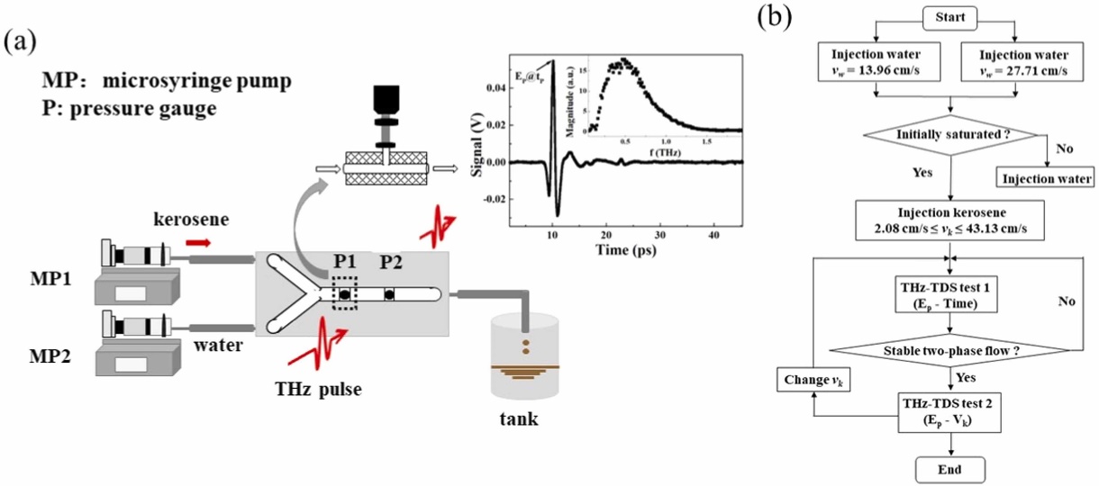 如圖1所示,本文利用透射式THz-TDS和微通道油水兩相流系統(tǒng)開(kāi)展實(shí)驗(yàn),根據(jù)兩相流的太赫茲光譜參數(shù)分析其相應(yīng)流動(dòng)條件下的流型。兩通道通過(guò)注射泵精確控制水相和油相的入口速度,“Y”型微流控芯片以聚四氟乙烯片作為基片,石英片為蓋片,并附著兩個(gè)采樣孔來(lái)進(jìn)行壓力數(shù)據(jù)的采集。