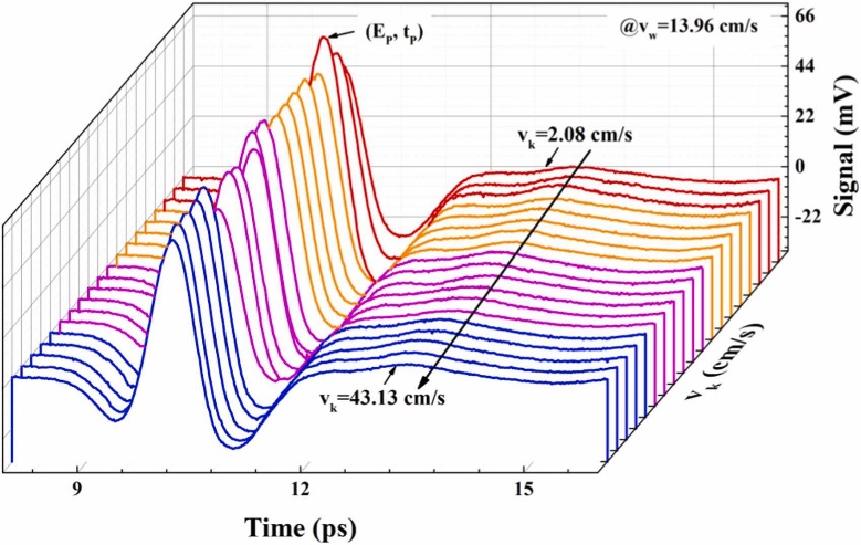 圖4和圖5為水相表觀(guān)速度(vw)為13.96 cm/s時(shí),改變煤油的表觀(guān)速度時(shí)在微通道中部采樣得到的穩(wěn)定流動(dòng)狀態(tài)的油水兩相流的太赫茲時(shí)域波形和相關(guān)參數(shù)。受油相速度的影響,油水兩相在微通道內(nèi)的相分布產(chǎn)生了變化,太赫茲光譜信號(hào)參數(shù)的上下波動(dòng)反映了不同的流型轉(zhuǎn)變。