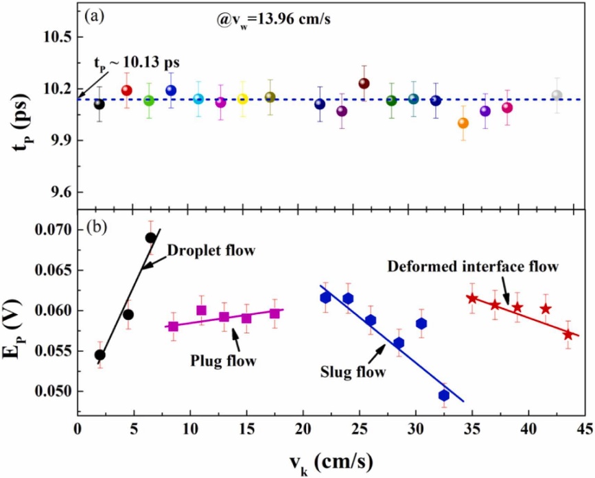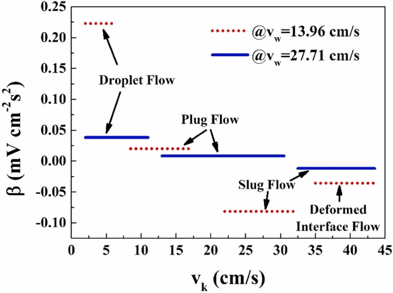 圖6和圖7展示了在固定煤油的表觀(guān)速度的情況下,改變水相流速的實(shí)驗(yàn)結(jié)果。Ep的結(jié)果表明,該情況下僅出現(xiàn)了液滴流、塞流、段塞流三個(gè)階段,兩相流的流型模式強(qiáng)烈依賴(lài)于煤油的流速。因此,可以通過(guò)參數(shù)β=k/vw建立流型和THz-TDS測(cè)試結(jié)果之間依賴(lài)關(guān)系。