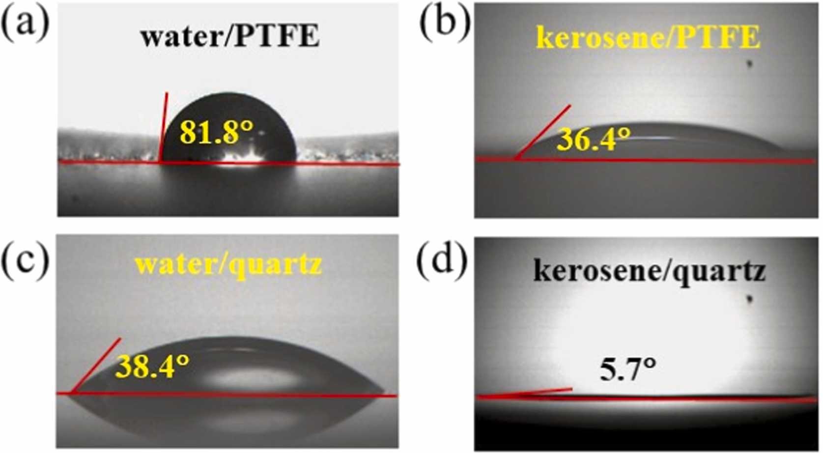 圖3(a)水和(b)煤油和PTFE的接觸角;(c)水和(d)煤油與石英的接觸角
