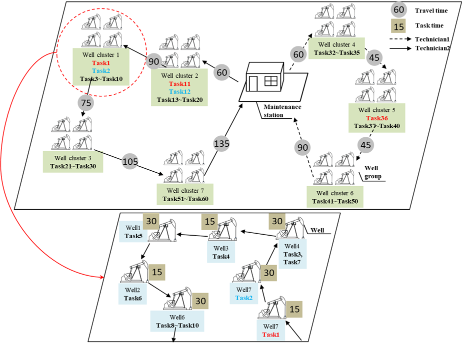 設備維護是油氣井現場日常運行管理的重要組成部分,對保證油氣井安全、盈利的生產運行起著至關重要的作用。高效的維護和管理可以提高生產效率、安全性和降低運營成本。面對不同地點和優先級的任務,確定每個技術人員的最佳任務順序以提高整體效率至關重要。