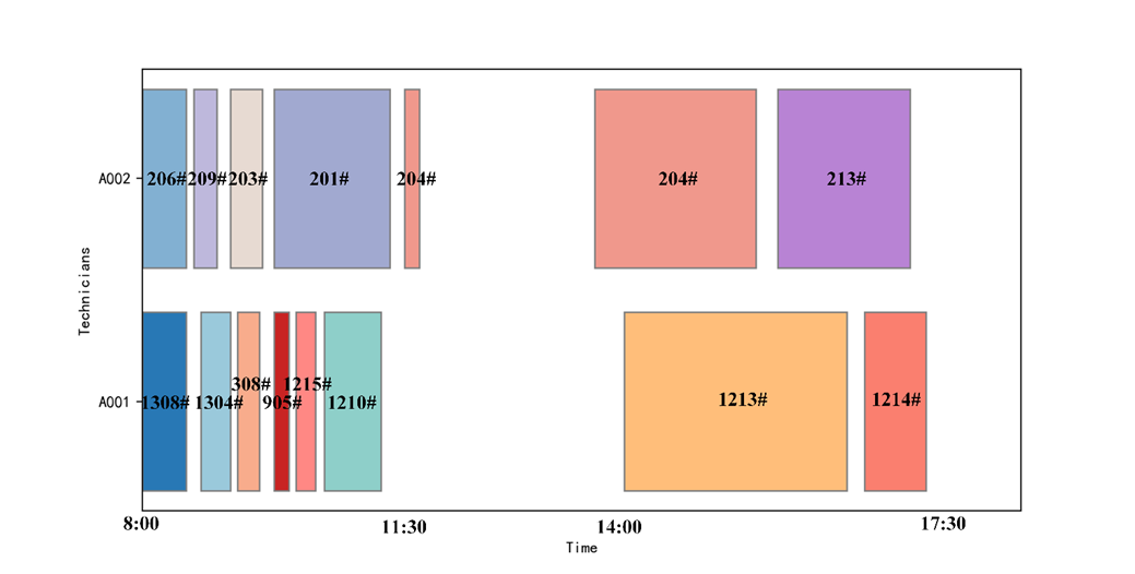 圖4顯示了另一個現場應用結果,其中實現了兩層優化策略。現有技術人員2人,其中高級技術人員1人,初級技術人員1人。重要任務23項,一般任務16項,緊急任務2項。為了便于區分,不同的數字和不同的顏色代表不同的實際井簇。每個集群有多個任務,屬于同一集群的任務在圖4中用相同的顏色表示。