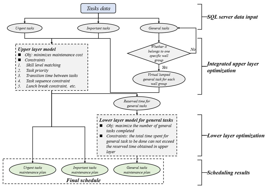 及時有效的維修調度是油氣田安全穩定運行的關鍵。具有多個優先級的大規模維修任務很難在可接受的時間內完成。為了加快計算速度,提出了一種兩層策略。在上層,為每個井簇生成一個集總任務。這種集總允許上層模型集中在緊急和重要的任務上,從而可以得到一個顯著減少規模的混合整數線性規劃(MILP)模型,以確定每個技術人員的調度和分配的時間長度。在底層,以上層預留時間為約束,為每個技術人員建立小規模的MILP模型。結果表明,我們的方法在效率上明顯優于完整的MILP模型。通過我們與業界的合作,該方法目前正在現實場景中實施。