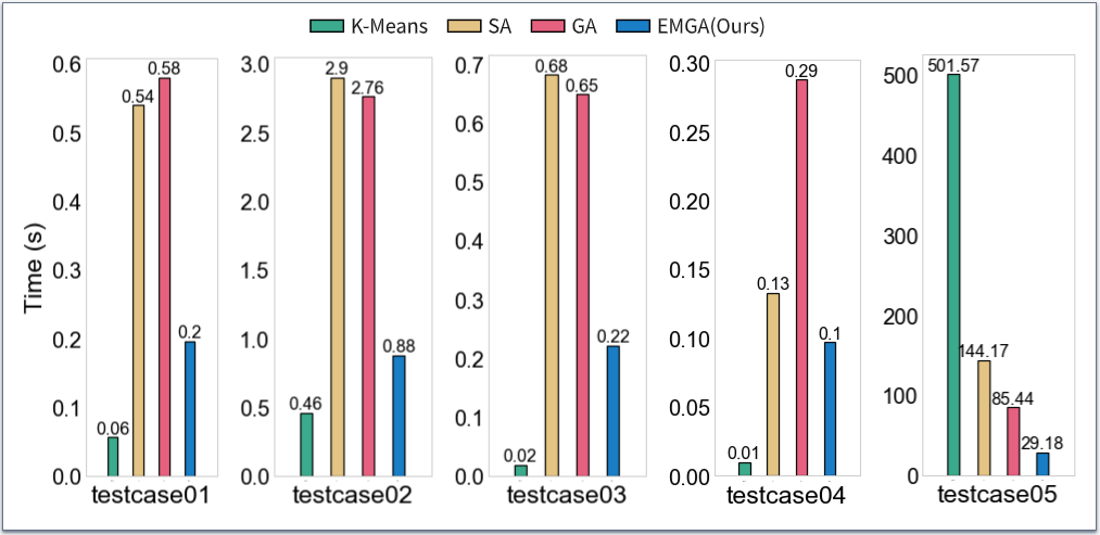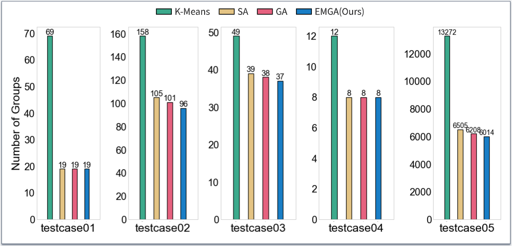 如上圖實驗結果所示,與其他方法比較,EMGA在最為關注的分組質量方面表現(xiàn)最好。EMGA結合了貪心算法和遺傳算法的優(yōu)勢。它能快速得到一個初始解,并且能夠通過改進的遺傳算法維護一個多解集合,其中包含了搜索到的多個優(yōu)秀解。這些解之間可能存在一定的差異,提供了更多的選擇余地。這使得我們的算法比樸素的遺傳算法具有更好的性能。相比之下,模擬退火算法和K-Means算法更容易受局部搜索的限制,可能陷入局部最優(yōu)解。模擬退火算法相對較容易陷入某個解附近,導致生成更多且相似的分組。K-Means算法本身傾向于找到局部最優(yōu)解而不是全局最優(yōu)解。