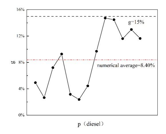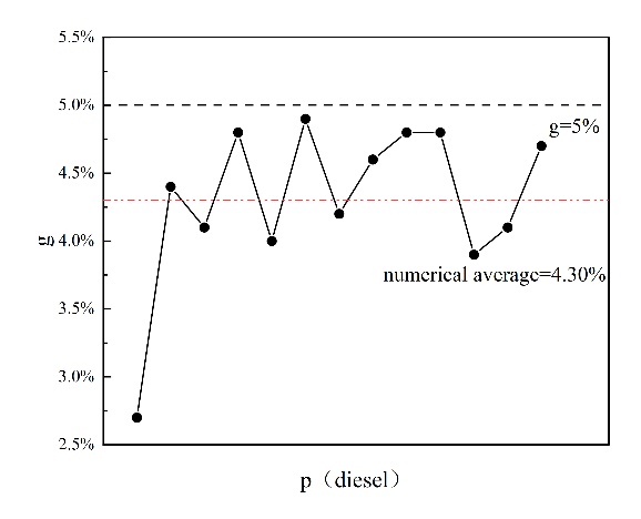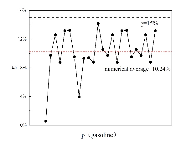 從圖3和圖4可以看出,當我們改變設定值 g 的大小時,目標餾分中優化后調和原油的收率差距仍然保持在設定的范圍內,這進一步證明了我們提出的優化模型能夠確保調和原油在設定的范圍內保持動態穩定,從而提高調和原油性質的穩定性以滿足后續生產要求。
