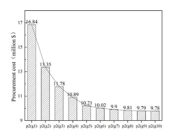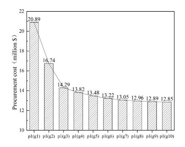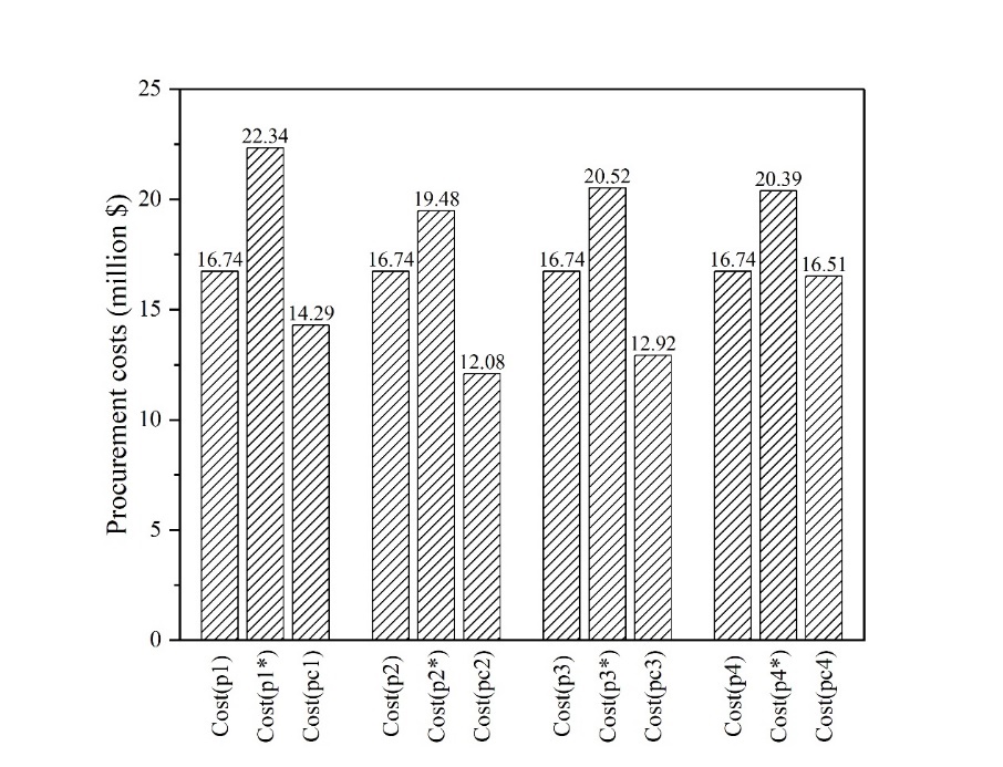 雖然較小的設定值 g 能夠使實際過程中調和原油的性質更加穩定,但僅關注調和原油性質的穩定性是不夠的;模型還需要考慮原油采購的成本。當設定差距值 g = 15% 時,案例1-4的原油采購成本如圖5所示。