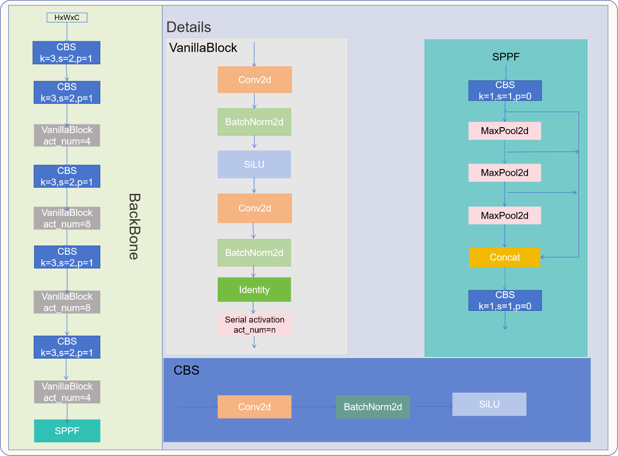 為了提升YOLOv8在GPU上的檢測速度,我們在VanillaBlock的基礎之上,搭建了一種新的骨干網絡Yolov8_VanillaBlock,其整體結構圖如圖2所示。