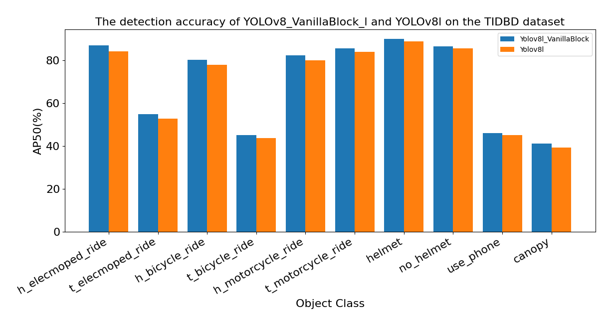 我們在TIDBD數據集上使用較大尺寸的YOLOv8l和YOLOv8_VanillaBlock_l模型進行實驗,以平衡檢測精度和模型大小。以平均精度(AP50)為評價標準對兩種模型進行比較。實驗結果表明(圖3所示),我們提出的YOLOv8_VanillaBlock_l在“use phone”、“canopy”等檢測類別上顯著優于原始的YOLOv8l。