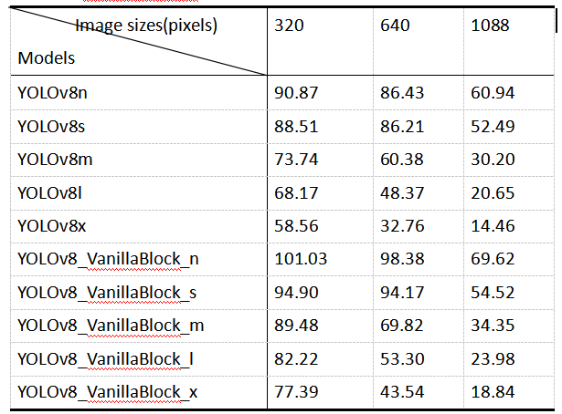 表3 YOLOv8_VanillaBlock與YOLOv8在不同尺寸的輸入圖片下的FPS