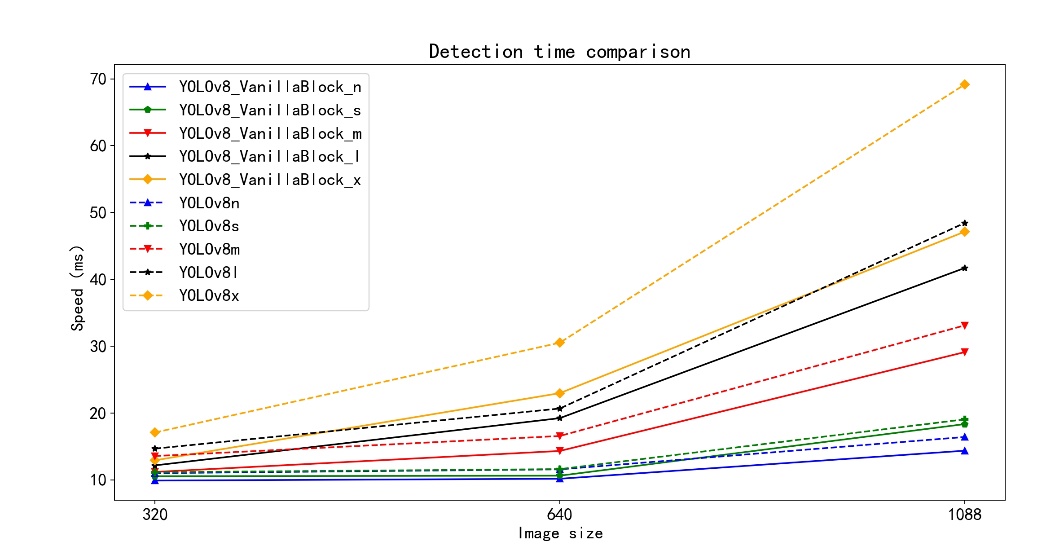 圖4 不同尺寸的YOLOv8_VanillaBlock與YOLOv8在不同大小的圖片上檢測時間的對比