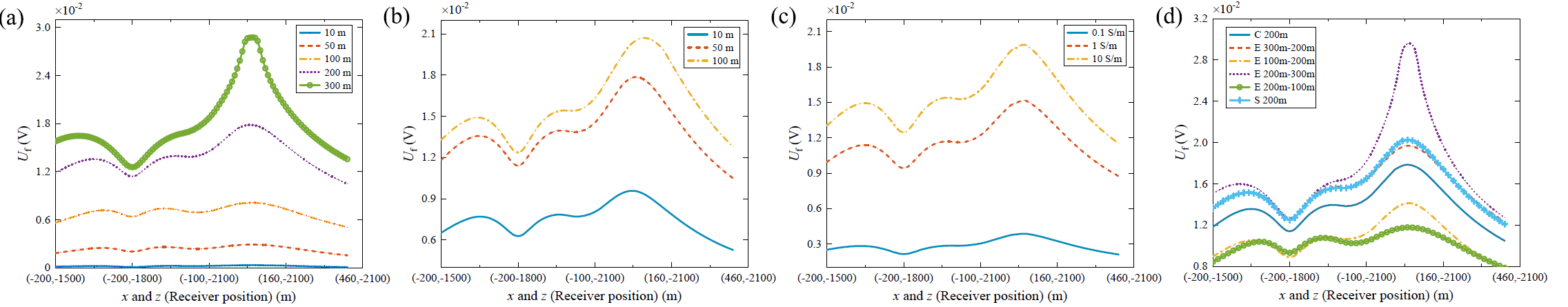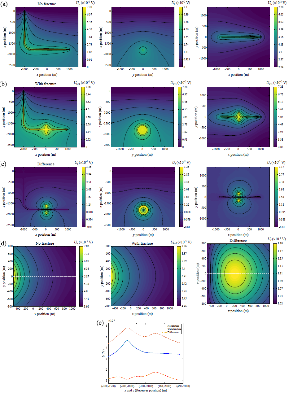 圖1顯示了驗證模型的二維橫截面,圖2顯示了響應結果。不難發現在壓裂前信號幅值隨著靠近套管井眼而增加,然而壓裂后,信號振幅整體增加,并且接收器水平移動時可以觀察到壓裂帶的峰值信號。通過比較壓裂前后的電位差,我們可以識別出峰值和谷值,分別表示裂縫帶沿z軸和x軸的信號強度。跨井測量方法的信號幅度比井地測量方法大3個數量級,顯著提高了裂縫帶的可監測性。因此,跨井測量方法對于監測水力裂縫是可行的,并且可以為電流測量提供令人信服的結果。圖3顯示了不同參數下對稱裂縫帶的電位響應,圖4顯示了復雜地質和井眼條件下的電位響應,圖5顯示了分段壓裂帶的電位響應。