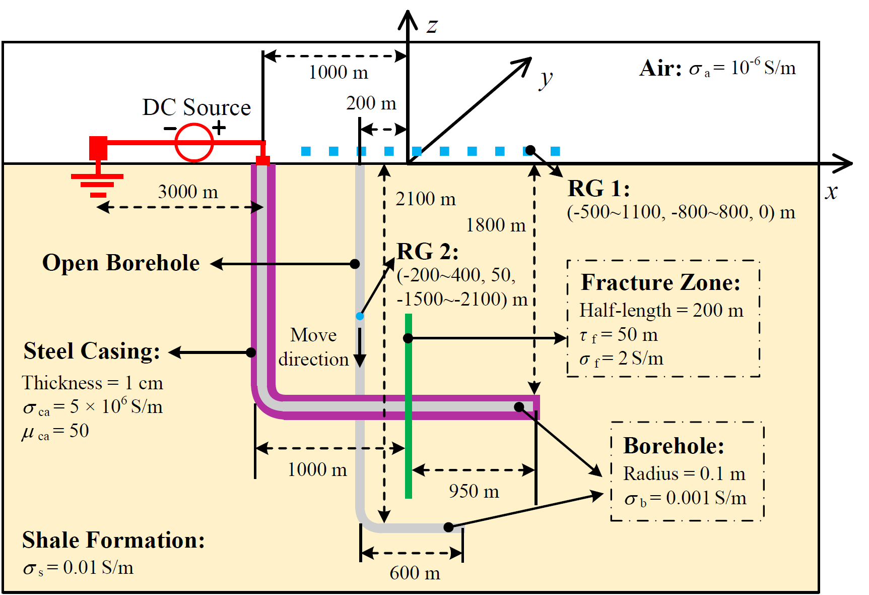 水力壓裂是能源開采中的一種關鍵方法,特別用于提高致密油藏中的石油回收率,并改善地熱資源的熱效率。由于頁巖地層的電導率低于電支撐劑裂縫帶,一些學者依賴電磁學發展了多種測井技術,旨在準確描繪裸眼井中的水力裂縫特征。然而,當在套管井中運用這些技術時,情況就變得更為復雜。這是由于常見的磁性鋼套管材料具有顯著的導電性,會造成透射電磁場嚴重衰減。基于上述背景,一些學者認為電流測量是獲取關鍵數據(例如地層邊界和儲層中的油氣飽和度)的有效手段。然而,這些方法往往伴隨著微弱信號的產生,這些信號極易被背景噪聲所掩蓋,從而大大增加了準確識別裂縫帶信號的難度。因此,我們考慮采用近場監測方法來提高裂縫帶的可監測性。