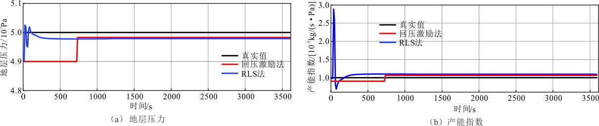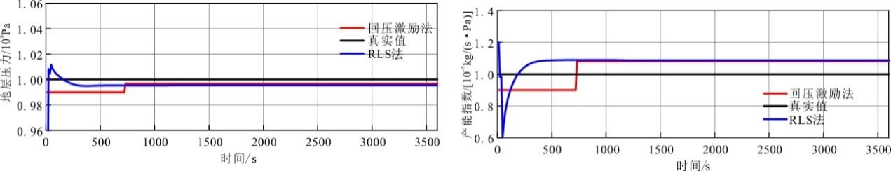 圖6仿真結(jié)果表明:針對7000米深井,回壓激勵法仍能在檢測到氣侵發(fā)生后較快地反演出地層壓力和產(chǎn)能指數(shù),其反演精度仍高于RLS法。