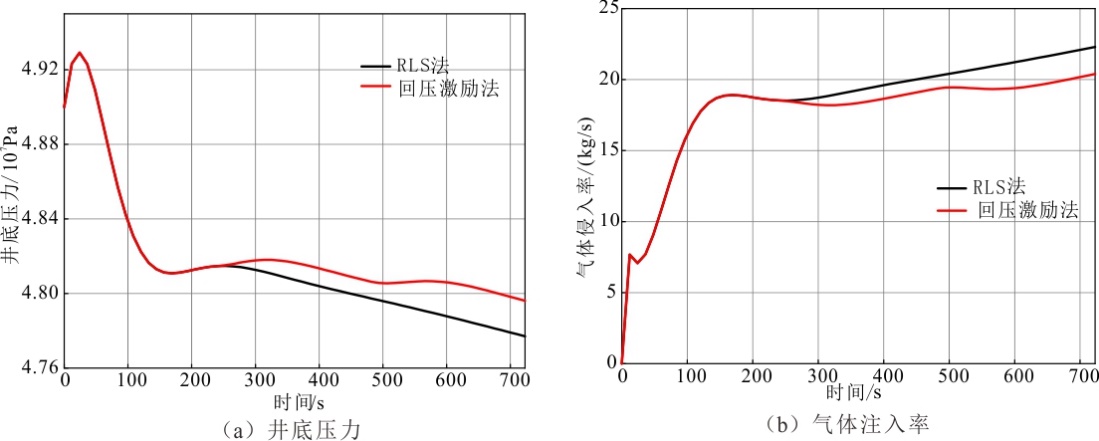 圖4仿真結(jié)果表明:兩種方法均能在氣侵發(fā)生后較快地反演出地層壓力和產(chǎn)能指數(shù),RLS算法反演速率略快于回壓激勵法,而回壓激勵法的反演精度略高于RLS法。由圖5仿真結(jié)果可知:回壓激勵算法需要實時采集足夠多的數(shù)據(jù),在其采集數(shù)據(jù)期間無法進行地層壓力的反演,導致其反演速度稍慢于RLS法。但因其在井口處施加了兩次回壓,采集數(shù)據(jù)期間一直有回壓作用于井口,會減緩井底壓力的下降和氣體的侵入速度。可以看出,回壓激勵法在采集數(shù)據(jù)期間能加速氣侵的衰減,一定程度上抑制氣侵的進一步擴大。