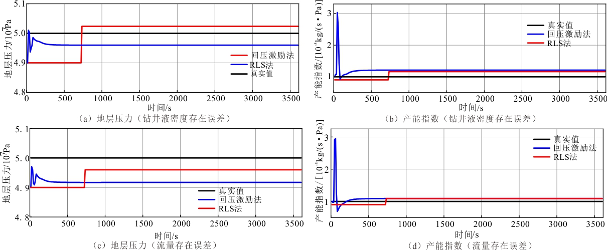 圖7仿真結(jié)果表明:在鉆井液密度和出口流量存在誤差的情況下,回壓激勵法和RLS法均能準確地反演出地層壓力,且回壓激勵法的精度略高于RLS法,其魯棒性更好。這與回壓激勵算法中采用井底壓力和出口流量的累積量來反演地層壓力有關,利用累積量在一定程度上提升了回壓激勵算法的魯棒性。